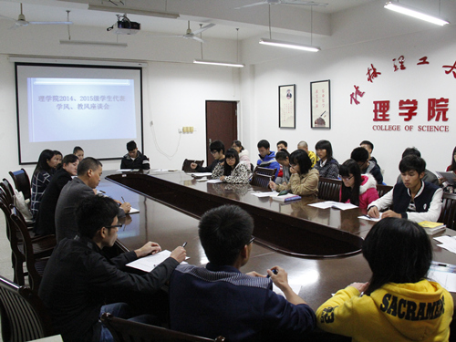 此次座谈会采用学生根据调研提纲进行自由发言和不记名调查问卷填写两种形式进行,主要围绕任课老师的授课态度、教学方法、课堂效果以及班主任开展班级学风建设的有效措施、谈心谈话的方式等内容进行展开。同学们积极发言,各抒己见,提出了较多有建设意性的意见与建议。理学院肖剑荣院长就理学院教学工作中的相关问题,与在场的同学们进行了深入交谈;理学院孙巍副书记就班主任开展工作的方式方法和同学们进行了交流。座谈结束后,学生代表填写了《理学院教风、学风建设调查问卷》,帮助理学院进行学风状况调查与改进。