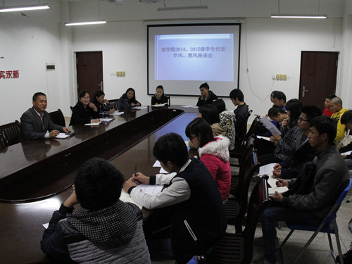 为了切实加强理学院教风、学风建设,提升任课教师的教学水平和班主任的管理水平,以学生问题为导向,全面掌握学生课堂和班主任日常工作的实际情况,理学院于11月11日晚7:00在雁山校区07115会议室召开了理学院2014、2015级学生代表学风、教风座谈会。理学院院长肖剑荣、院党委副书记孙巍与学生代表参加了此次座谈会。会议由理学院党委副书记孙巍老师主持。