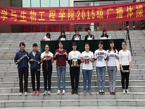为激发大学生开展体育锻炼的积极主动性,养成良好的体育锻炼习惯,磨练学生意志品质,提高学生身体素质,2015年11月14日14:30,化生学院在雁山校区萃华楼广场举行“化生风采,活力青春”新生广播体操比赛。化生学院13级辅导员陈文甫老师,15级辅导员李冲老师,学院团委学生会主席韦洁婷,党建办公室主任黎尖以及楼管委主任林倩出席本次比赛并担任评委。