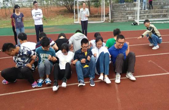 团体心理活动主要分为游戏和心理分享两个环节。2013级社工专业的70多名同学分成12个小组,分别带领12个班级开展团体心理活动。游戏环节包括连环自我介绍、萝卜蹲、“蜈蚣”翻身、解手链、五毛一块、蹲坐搭桥等,内容丰富形式多式的小游戏有助于大一新生彼此间融洽关系,拉近距离,足球场上,到处洋溢着他们欢快的笑声。