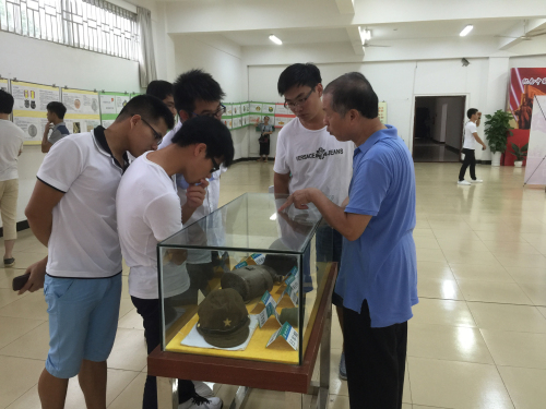 观览前,周教授为大家简单讲解了本次专题展览的组成及其举办制作展览的缘由,希望通过以广西为背景题材的展览能帮助广大年轻人对这段历史有所知晓并激励他们以史为鉴开创未来。其展览的内容丰富,包括“广西血性军人 忠勇以身报国”“八桂父老乡亲 齐心抗日救国”“在桂国际友人 抗战志同道合”“开展游击战争 全民保家卫国”等15个篇章,并且在展厅还展示着抗日游击队短刀、手雷、日军防毒面具、日军迫击炮炮弹等实物。