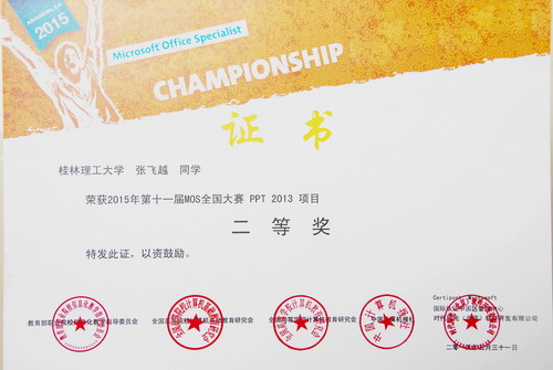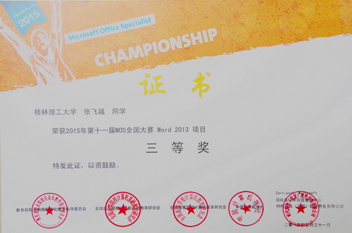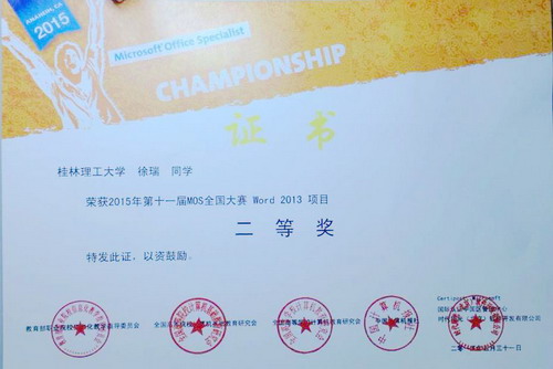 5月28日至31日,2015年第十一届MOS全国大赛暨MTA全国大赛在北京举行,信息学院徐瑞同学分别获得Excel 2013项目一等奖,Word 2013项目二等奖;张飞越同学分别获得PPT 2013项目二等奖,Word 2013三等奖,我院学生展现了良好的精神风貌和拼搏精神。