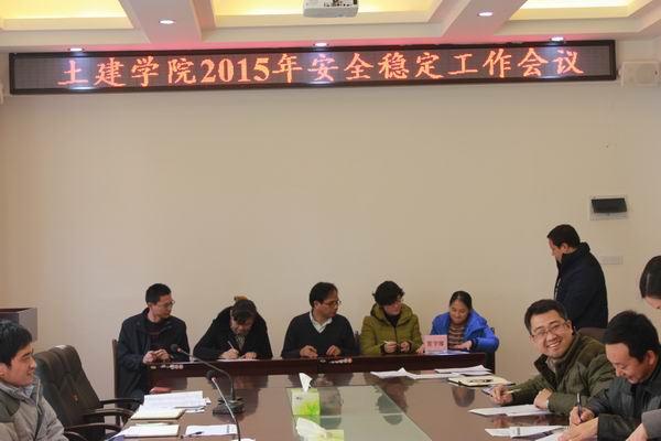 为认真贯彻全区学校安全稳定工作视频会议和学校2015年安全稳定工作会议精神,3月12日下午,学院在04216会议室召开安全稳定工作会议。学院党政领导班子成员、各教研室负责人以及两办相关人员出席了此次会议。会议由学院党委书记熊英主持。熊书记强调,学院党政领导班子以及院属各部门要高度重视安全稳定工作,全面贯彻落实学校对安全稳定工作的新要求等内容。最后,熊英书记、韦昌富院长分别与学工办等院属各部门签订了《土木与建筑工程学院2015年社会治安综合治理、安全稳定和消防安全目标管理责任书》。