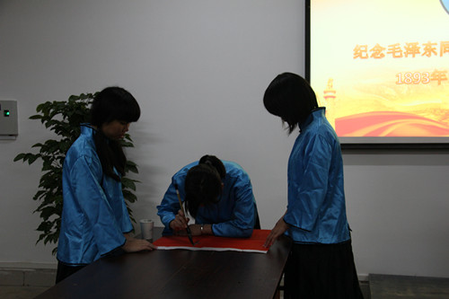 紧接着,来自我院化工2014级卓越班的同学通过朗诵毛泽东同志的词——《沁园春·长沙》、来自校书法协会的同学通过现场书法表演向一代伟人毛泽东致敬,以大学生独特的方式纪念了毛泽东同志121周年诞辰。最后,活动在全场同学一起朗诵“三爱”主题诗的激昂声音中圆满落下帷幕。