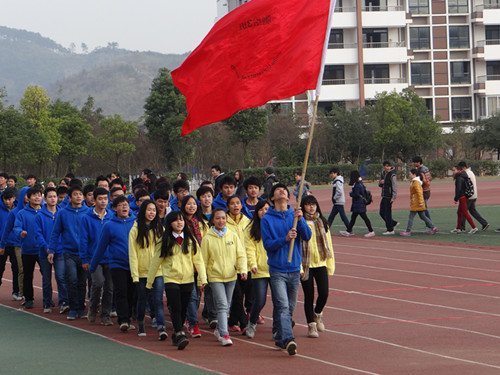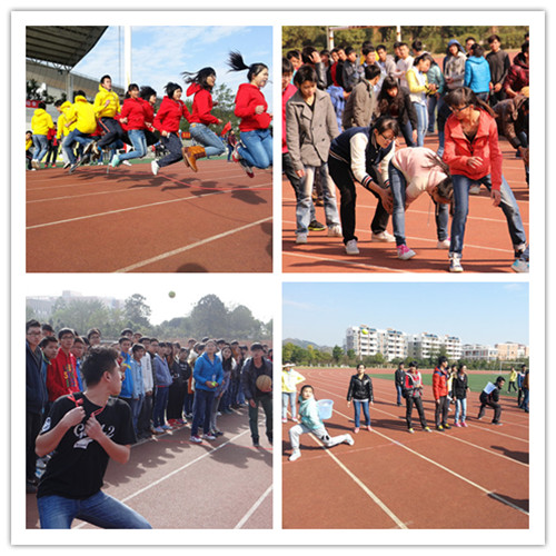 班级趣味运动会开幕仪式新颖,各班自主设计的班旗展示和彰显班级风采的口号令会场气氛热烈、活泼。趣味运动会的各个项目由同学们自主讨论商定,注重集体参与和团队协作,融趣味性和竞技性于一体。班级长绳、海底传月(广西少数民族体育项目)、六人七足、100米迎面接力跑等一项项活动伴随着同学们的助威声、笑声中依次开展,一起跑、一起跳;你传给我、我递给你---,各个项目在彰显了学院班级凝聚力和战斗力的同时,同学们的青春风采也因运动而闪光。