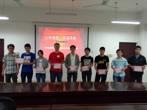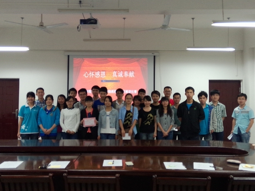 为了使国家资助政策深入心,确保各项政策能够更好地顺利实施,使同学们在受到资助的同时要学会感恩,2014年4月12日,理学院扬帆社在07115组织开展以“心怀感恩、真诚奉献”为主题的演讲比赛。