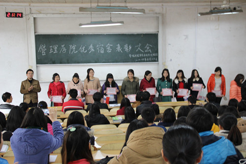2014年3月21日中午,学院在屏风校区2102教室举行2013-2014学年度秋季学期优秀宿舍表彰大会,对上学期宿舍卫生检查成绩优秀和宿舍学习氛围浓烈的宿舍进行了表彰和奖励。学院党委副书记欧阳胜权老师、团委书记黎超业老师以及辅导员吕生富、卓琳老师出席会议,学院屏风校区11、12级各班班长团支书及各班宿舍长代表参加会议。会议由学院辅导员曾丽萍老师主持。