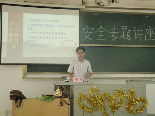 为使安全工作真正落到实处,统筹推进理学院安全管理实效,使新生发现身边的安全隐患,将安全问题牢记于心。 9月18日上午10点30分,在雁山校区06408教室,理学院党委副书记冯广辉老师为2013级新生带来一场安全教育讲座。理学院团委书记郝文佳老师,13级辅导员梁译匀老师出席本次讲座。