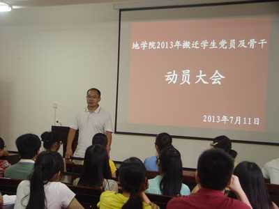 7月11日下午,我院硕士研究生及本科生全体党员及骨干集中4406报告厅召开2013年搬迁动员大会,学院党委副书记耿俊茂和辅导员莫长庆老师出席会议。