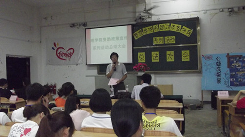 活动伊始,管理学院团委书记黎超业老师在大会上进行了活动总结大会,说明了本次资助宣传月的宣传内容、意义和成效。同时他向各位同学提出了三点希望:一是希望每位同学及早找准自己的定位和目标,并为之而努力;二是希望每位受资助的同学利用好每一分钱,不要挥霍浪费;三是希望每位受资助的同学时时刻刻对学校对社会抱有感恩之心,用实际行动去回报社会。