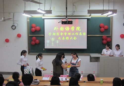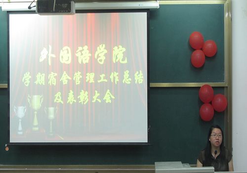 5月30日周三晚上19:30我院在07518教室召开了学院宿舍管理学期工作总结及表彰大会,会议由外国语学院党员宿舍管理委员会干部于清和刘玉凤主持。院党委副书记江玲老师、辅导员王威老师及学院11-09级生活委员、宿舍长出席了会议。