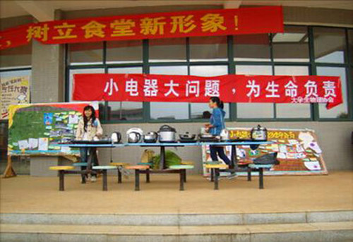 为进一步加强我院学生宿舍安全,增强学生安全用电的意识, 4月25日,理学院大学生物理协会在学院老师的指导下,在雁山校区二号食堂广场开展了题为“小电器大问题,为生命负责”的安全使用电器宣传活动。