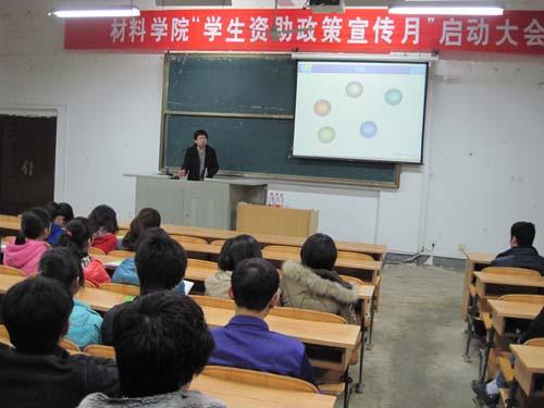 2012年3月16日晚7点,材料科学与工程学院“学生资助政策宣传月”启动仪式于6栋105教室举行,我院2011级辅导员王迎波老师出席了仪式并作重要发言,同时启动仪式还邀请了我院自治区三好学生,桂林市优秀共青团干无机08-2班莫贞彪同学与所有受助同学分享了自己的大学四年心得。
