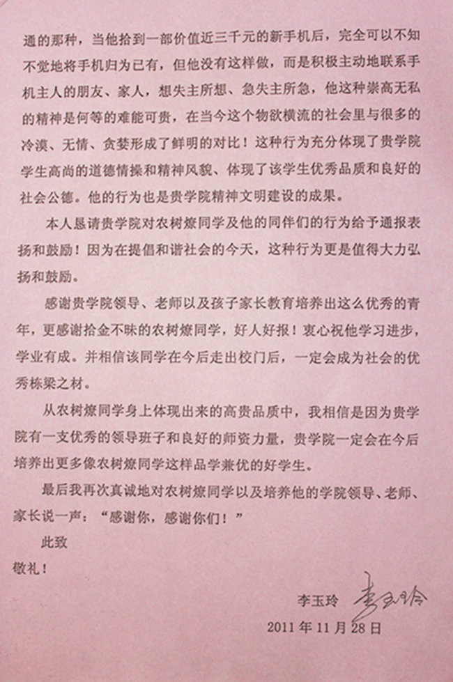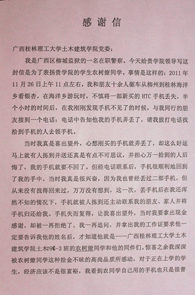 2011年11月26日早上,我院土木工程09-3班农树燎同学在桂林海洋乡拾得一部价值近3000元的HTC新手机,并主动联系手机中联系人找到失主,拒绝了失主的现金答谢,将手机物归原主。 失主是广西区柳城监狱的一名在职警察,对农树燎同学拾金不昧的精神大为赞赏,特地写来一封感谢信以示感激之情,感谢信内容如下: