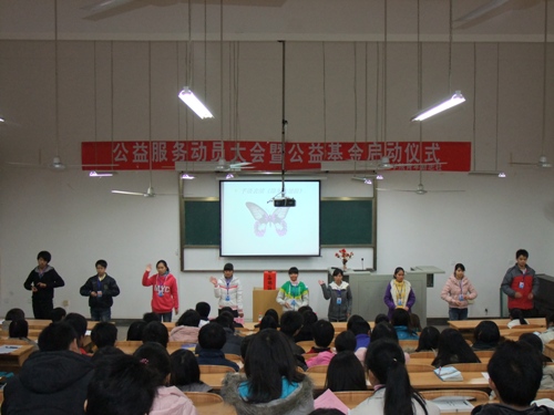 为进一步完善我院学生资助体系,强化学生责任意识和感恩意识,2011年12月11日晚7:30,人文社会科学学院青年励志社在雁山校区07518隆重举行“公益服务动员大会暨公益基金启动仪式”。出席此次会议的嘉宾有我院负责学生资助工作的陈琳老师,我院团委副书记张晓君、学生会主席吴俊生、副主席胡靖波,此外,我院本年度获得奖助学金的学生参加了本次活动。