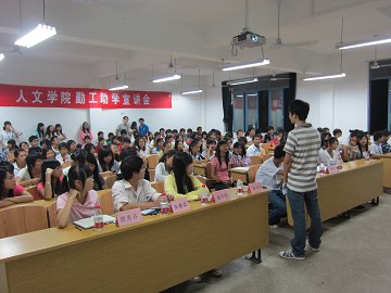 为增强我院困难学生自立自强意识,培养学生吃苦耐劳的精神,同时使广大学生更清楚地了解我校勤工助学政策,提高我院困难学生的勤工助学上岗率,由人文社会科学学院团委主办,学院青年励志社承办的勤工助学经验交流会于2011年10月12日晚20:00在雁山校区06201教室举行,我院主管困难学生工作的辅导员陈琳老师出席了本次宣讲会。