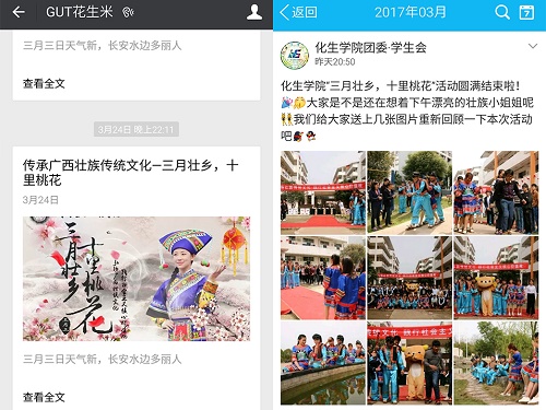 通过学院微信公众号“GUT花生米”、团委·学生会QQ官方账号、学院易班搭建线上宣传平台,进行广泛的宣传,打造“三月三”网上教育主阵地,营造良好的节庆氛围。