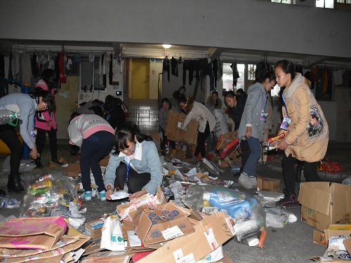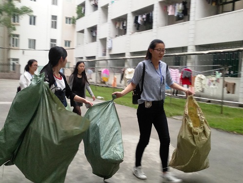 4月14日下午六点,志愿者们在宿舍生活区内集合,经过分组、分发工具、安排楼层等一系列准备工作,大家开始下寝室收集废品。此次活动主要在1栋、3栋、4栋、6栋、7栋、16栋、22栋、23栋、25栋宿舍楼开展,每组志愿者分别到各自所分派楼层的寝室礼貌询问、收集废品。在励合社社长的工作指导下,活动有条不紊地进行,各组成员陆续将收集到的废品拿到宿舍楼下的指定地点。活动最后,成员们将废品进行分类、收集装袋,并进行清点与结算。