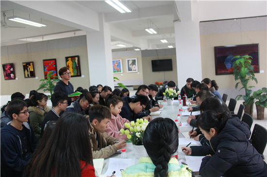 2017年2月28日下午艺术学院于博雅楼美术馆展厅内召开了“践行两学一做、倾听学生呼声”——艺术学院书记、院长面对面座谈会。学院党委书记张成龙、副院长(主持工作)李本建、党委副书记万千、院长助理符晗及院办主任、教学秘书、全体辅导员出席会议。学院学生干部、学生党员、普通学生等各级层面的40多名学生代表参加了座谈会,会议由辅导员张萌萌老师主持。