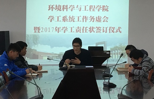 根据学院2017年工作要点及要求,为保证学院学生工作的顺利完成,提升学院学工队伍建设水平,2017年1月3日下午,环境学院学生工作办公室在12407会议室举行2017年学生工作务虚会暨学工责任状签订仪式。学院党委副书记郝文佳,团委书记唐红兵及全体辅导员参加会议并签订了学生工作目标责任状。