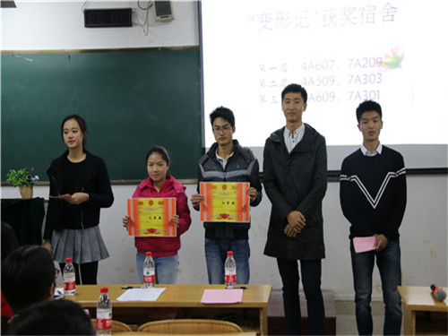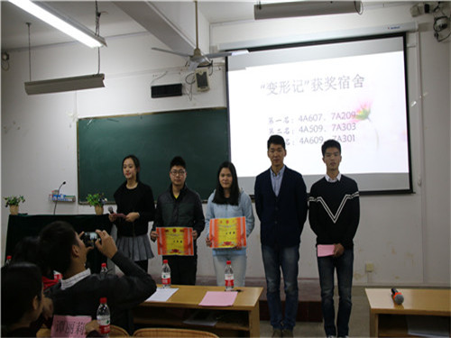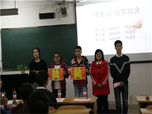 在一阵阵热烈的掌声中颁奖典礼拉开了帷幕。首先饶老师针对我院大三宿舍“变形记”活动的开展进行了总结并且对同学们提出了殷切希望,她说到宿舍“变形记”活动是应社区文化节的要求,进一步改善我院大三年级学生宿舍卫生环境的举措,同学都积极参与其中,为自己创造一个温馨和谐的宿舍环境。她还说到,宿舍装饰是同学们对自己生活环境美化的过程,通过本次装饰大赛,为同学们营造“家”的氛围,为接下来和谐大学生活起到很好的促进作用。接着楼管委通过PPT为大家展示了本次宿舍装饰大赛以及“变形记”活动中优秀获奖宿舍的风采,此外楼管委副主任奚怀同学就“变形记”活动中出现的优点和不足做了相关总结。据悉,本次“变形记”活动共评选出获奖宿舍6个,宿舍装饰大赛共评选出“最佳环保奖”、“最佳化学奖”等共10个宿舍。在同学热切的期盼中三位老师为活动中获奖的宿舍颁发奖状。