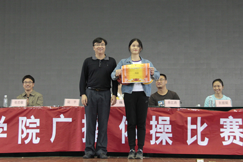 首先,陆平书记致开幕词,他向为筹备这次比赛付出辛勤劳动的老师、学生和相关工作人员表示衷心的感谢。他希望同学们发扬团结一致、奋发向上的精神,用整齐的步伐,标准的动作,飒爽的英姿来体现我院学生的青春风采,努力发挥,赛出风格,赛出水平,预祝本次广播操比赛取得圆满成功。随后的比赛中,参赛的班级身着统一的服装,动作规范整齐、整齐划一。各位班主任老师以身作则积极参与到比赛中,与同学们共同完成,同学们也受到激励和感染,比赛中热情高涨,个个都表现得精神饱满,充满朝气和活力,展现理院学子积极进取、乐观向上的精神风貌。经过激烈的角逐,应物15-2班以规范整齐的动作和团队协作的精神赢得了各评委的一致好评,夺得了桂冠。同时,统计15-3班、统计16-2班获得比赛二等奖;信科14-2班、统计14-2班、统计15-1班获得三等奖;优秀奖获得班级有统计15-2班、统计15-4班、统计16-3班、统计16-4班。应物15-2班韦贤露同学、统计16-2班许郭平同学获得优秀领操员称号。