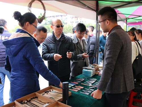 (四)“设计+”创新创业作品展区,旨在实现作品到产品再到商品的转换;展品主要是来自于大学生创新创业项目以及梦想创业同学们的优秀制品,主要有校园纪念品7类190件,手工鳄鱼皮表带和手工花环30件,3D打印5件等。