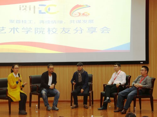 11月12日上午, “设计+”艺术学院校友宣讲会暨就业创业分享会在雁山校区图书馆报告厅举行。艺术学院邀请到了96级校友上海轩逸设计有限公司CEO兼设计总监彭政、96级校友厦门椰枫生态科技有限公司厦门分会副分会长刘清华、01级校友深圳三米设计机构设计总监韦志峰、04级校友指尖大学创始人冀志磊,出席会议,会议由学院党委副书记万千主持。
