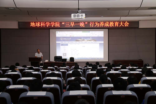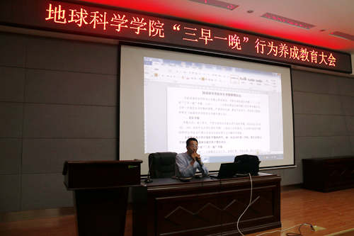 教育大会分层次、分年级分别进行了上下两场。会上,首先播放抓拍的“三早一晚”影像资料进行警示教育,并由各年级辅导员带领大家再次学习解读《地球科学学院考勤管理办法》。耿书记在讲课中,围绕“讲规矩,守纪律”的话题,从行为养成的特点出发,引导学生要实现幸福感和价值感,要勇担当、重责任;在纪律要求方面,着重强调精神面貌和制度规范,倡议班委进行对口帮扶、督促,并对开设日常行为养成教育课堂进行说明;为实现“家、校、生”三方有效沟通,多方协同努力,切实提升学生综合素质,耿书记现场解说学院相关做法,号召同学们共同参与、相互成长。此外,针对近期“校园贷”、电信诈骗、兼职诈骗等危害校园安全事件,耿书记在会上专门进行安全教育,提高学生防范意识。