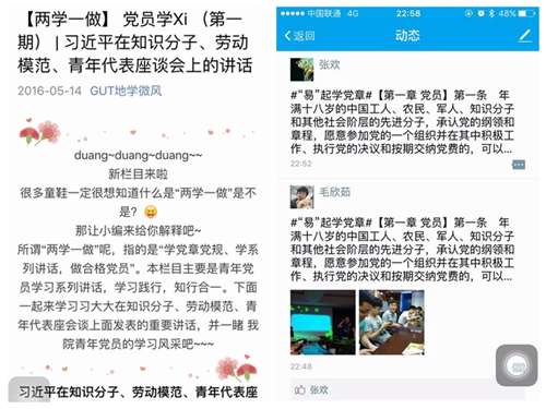党员应发挥先锋模范作用,不但带头先进,更要带领广大同学共同优秀。结合当下“互联网+”环境背景,依托易班、微信等新媒体平台,地学院学生党员在通过“‘易’起学党章”话题,每天分享一条党章内容,将历时53天与大家共同重温党章。此外,在《党员学Xi》栏目中,学生党员们将自己学习系列讲话的内容和心得体会在线上与同学们分享,营造良好而热烈的学习教育氛围。