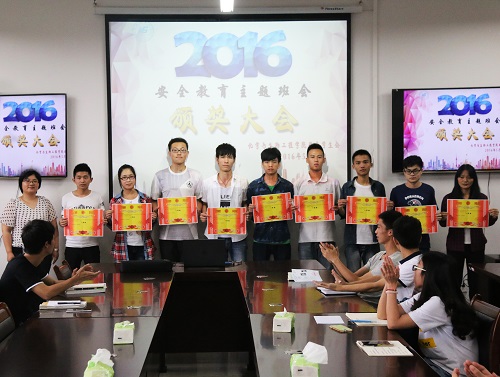 关爱你我安全,共创和谐校园。为深入贯彻落实学校安全会议相关要求,近日,我院组织开展了系列安全教育主题班会评比活动。并于5月18日中午,于12217会议室举行了2016年安全主题班会颁奖仪式,各班代表参加了本次颁奖仪式,团委书记饶筠筠老师为获奖班级颁发奖项。