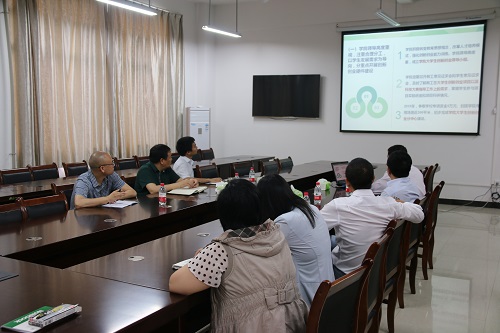 校团委周国桥书记对我院创新创业教育推进的情况进行了肯定,并对大学生创新创业教育与专业教学、师资队伍建设等方面的有机结合提出了建议,特别指出学院要集中优势力量推进第二届“互联网+”创新创业大赛项目的申报和指导工作。教务处覃业飞副处长对我院在大学生创新创业教育中推进的“四大平台”建设表示肯定,并从加强“校中厂”宣传工作、完善大学生创新创业教育奖励制度等方面提出了相关建议。