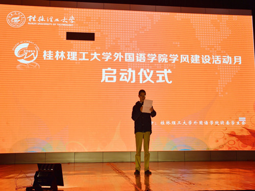 为认真贯彻落实学校2015年学生工作专题会议精神,稳定推进学校和学院学风建设工作,12月11日晚上,外国语学院在雁山校区体育馆召开了外国语学院学风建设启动仪式。学院党委书记陈文乾,校团委副书记陈小波,外国语学院党委副书记江玲、人文社会科学学院党委副书记汪晟,旅游学院党委副书记叶婷,外国语学院副院长胡金、唐渠、陈湘柳,外国语学院团委书记钟立军,外国语学院日语调研室主任曾文华以及各兄弟学院辅导员以及学生会代表出席了此次启动仪式。