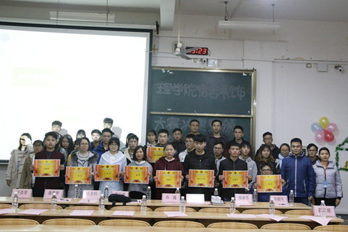 为丰富校园文化生活,创造温馨舒适、文明安全的社区环境,为我院学生营造一个良好的宿舍文化氛围。11月24日19:30理学院于雁山校区06409教室举办了以“党的十九大精神进校园,寝室新风采随我创”为主题的宿舍装饰大赛决赛暨颁奖仪式。学院党委副书记孙巍老师、团委书记单江涛老师、17级辅导员李鹏宇老师和学院团委学生会主席团以及各兄弟学院生活部部长受邀参加出席了本次活动。