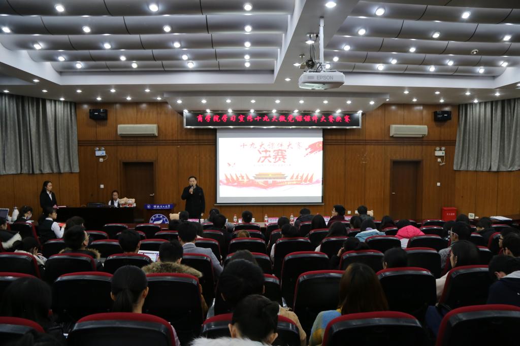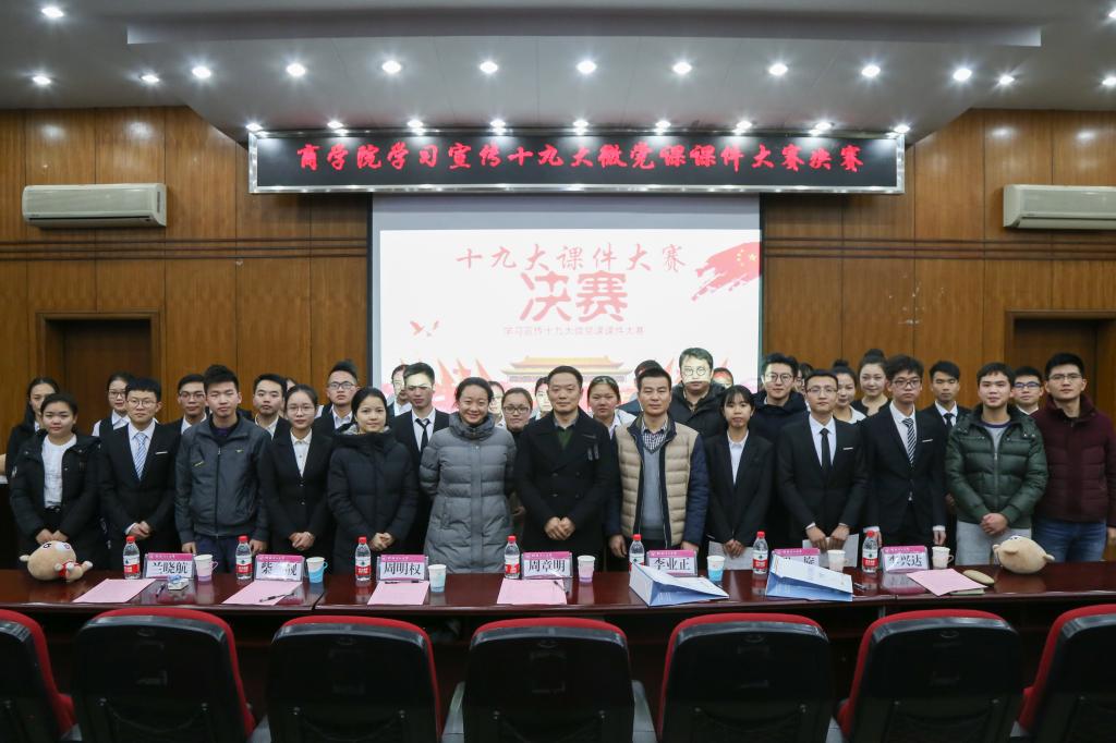 为深入贯彻落实《中共中央关于认真学习宣传贯彻党的十九大精神的决定》文件精神,由商学院主办,商学院易班工作暨传媒中心承办,商学院学生党务中心与院团委学生会协办的“学习宣传十九大”微党课课件大赛决赛于12月19日在9501会议室举办。本次大赛评委由商学院党委书记周章明、校组织部党委党校办公室主任周明权、校宣传部网络宣传科柴靓、商学院院办主任李业正、商学院15级辅导员贺旋、商学院16级辅导员兰晓航、商学院党办秘书李兴达担任,商学院党委副书记张瑞出席本次大赛。此次比赛中选手们热情饱满、大显身手,比赛现场更是精彩纷呈。