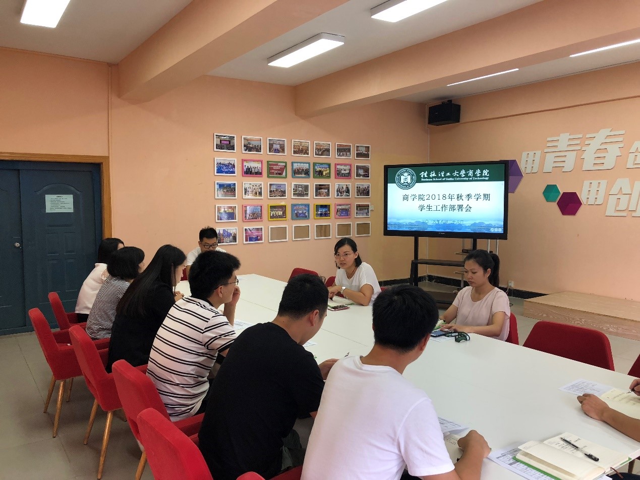 8月28日上午,商学院在屏风校区7401路演中心召开2018秋季学期学生工作部署会,学院党委副书记沈菲菲以及全体辅导员参加会议。