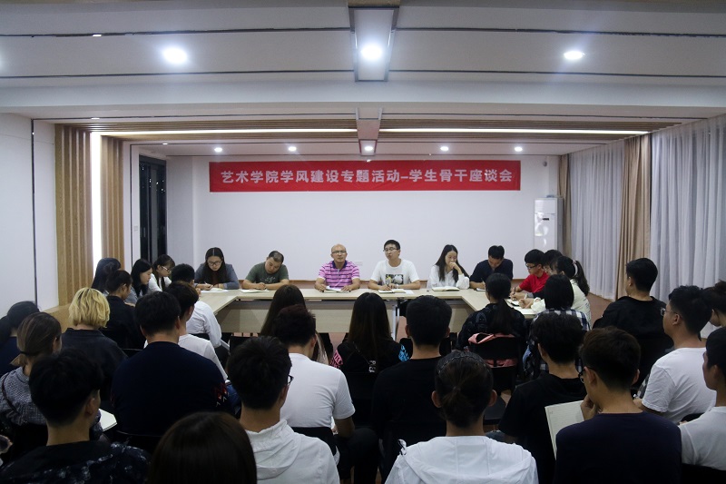 2018年9月29日晚,艺术学院于三栋博雅楼101室召开以学风建设为主题的学生骨干座谈会,学院党委副书记苑守瑞、团委副书记(主持工作)张萌萌、辅导员陆琴、郝佳佳、王成圆、曹权玺老师及学生干部与学生党员代表参加了此次座谈会。