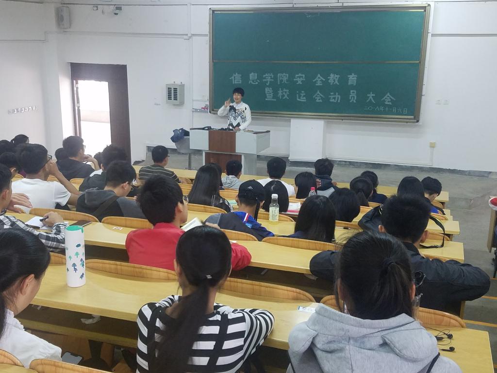 2018年11月6日,信息学院在教5栋05102组织开展安全教育暨校运会动员大会,学院团委学生会主席团、各部长及学生运动员,扬爱协会、奋斗社、龙狮协会、学院纠察队、新媒体中心等负责人到场参加。本次大会由学院党委副书记刘志丽主讲,学院辅导员肖利斌主持。
