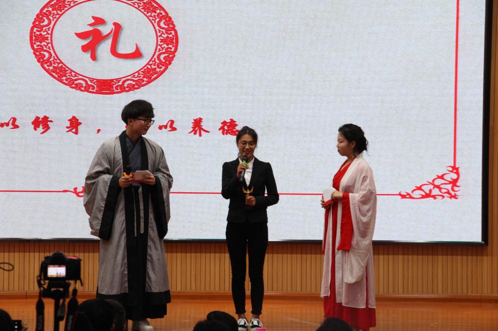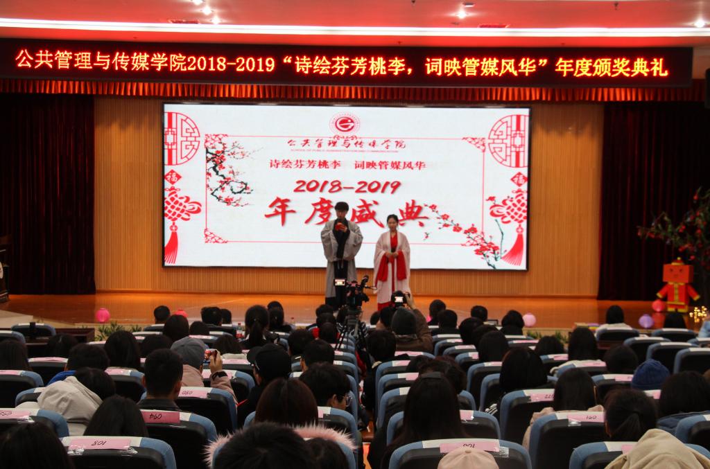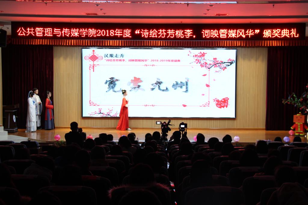 本次年度颁奖盛典共分为“礼、智、仁、义”四个章节。典礼在古典舞《礼仪之邦》中拉开帷幕,随后,活动上分别对2018学年在德、智、体、美各个方面表现突出的优秀学子们进行了表彰,其中包括先进班集体、三好学生、优秀学生干部以及各项先进个人等11项大类奖项。在典礼上,优秀学生代表们与同学们分享了自己的心得体会。学习上,要善于把想法转化为行动,并且坚持不懈,迎难而上;生活上,要加强锻炼,注重饮食规律,提高身体素质;心态上,要懂得饮水思源,心怀感恩。与此同时,在本次典礼的各个章节中穿插了汉服走秀表演、相声表演《我们这一年》、古典舞《不染》以及飞花令、投壶、锦囊抽奖等游戏。各式各样的节目与游戏给在场的老师和同学带来了欢乐和美妙的视听盛宴的同时,也充分展现了公共管理与传媒学院师生的风采及表达了对2019年最诚挚的祝福和期许。
