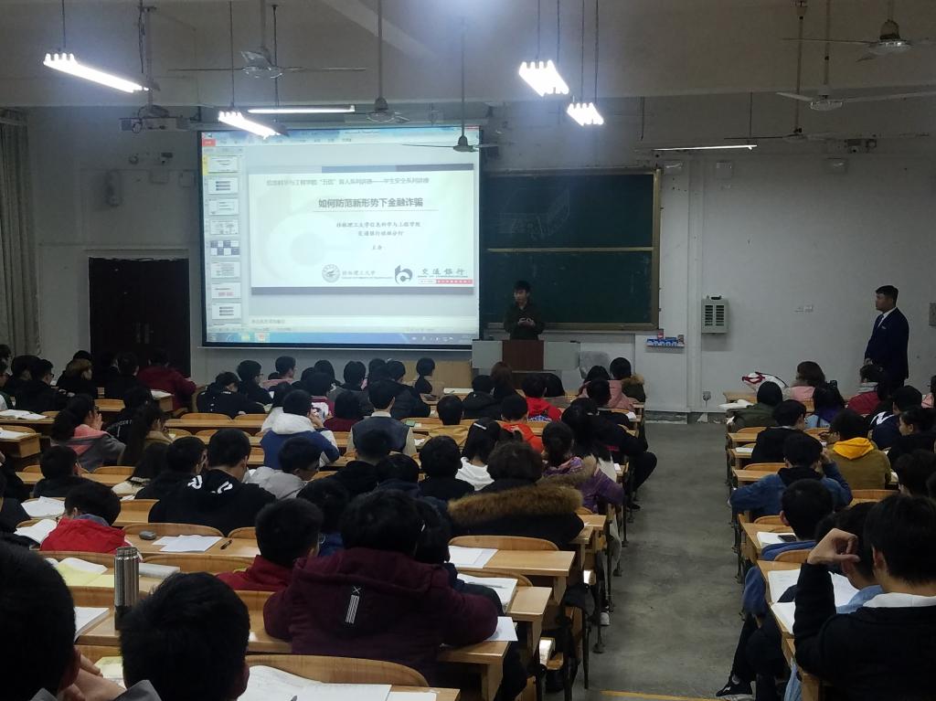 2019年3月6日-7日,信息学院在雁山校区教五栋和教六栋组织开展"五信"育人系列讲座—"防范金融诈骗与诚信建设"讲座,本次讲座分为4场,参与讲座的人员包括交通银行桂林城中支行马红英行长及其同事和学院1000余名学生,其中邀请交通银行桂林城中支行的欧阳经理和唐经理主讲,本次活动由学院李雪君老师主持。