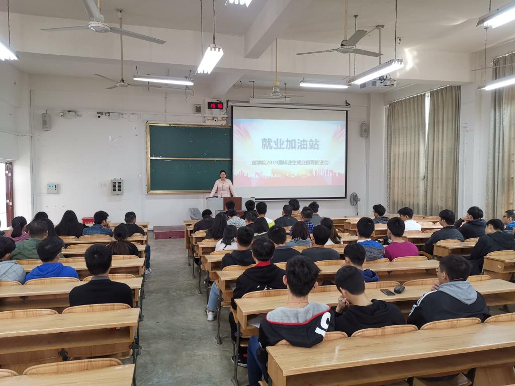 为引导毕业生合理择业,充分调动求职的积极性,由理学院学工办组织的就业指导主题系列活动——2019届毕业生“就业加油站”于3月11日在雁山校区06104教室举办。学院副书记孙巍、学工组长兼2019届毕业生辅导员杨剑及学院100多名2019届在校本科毕业生共同参加。