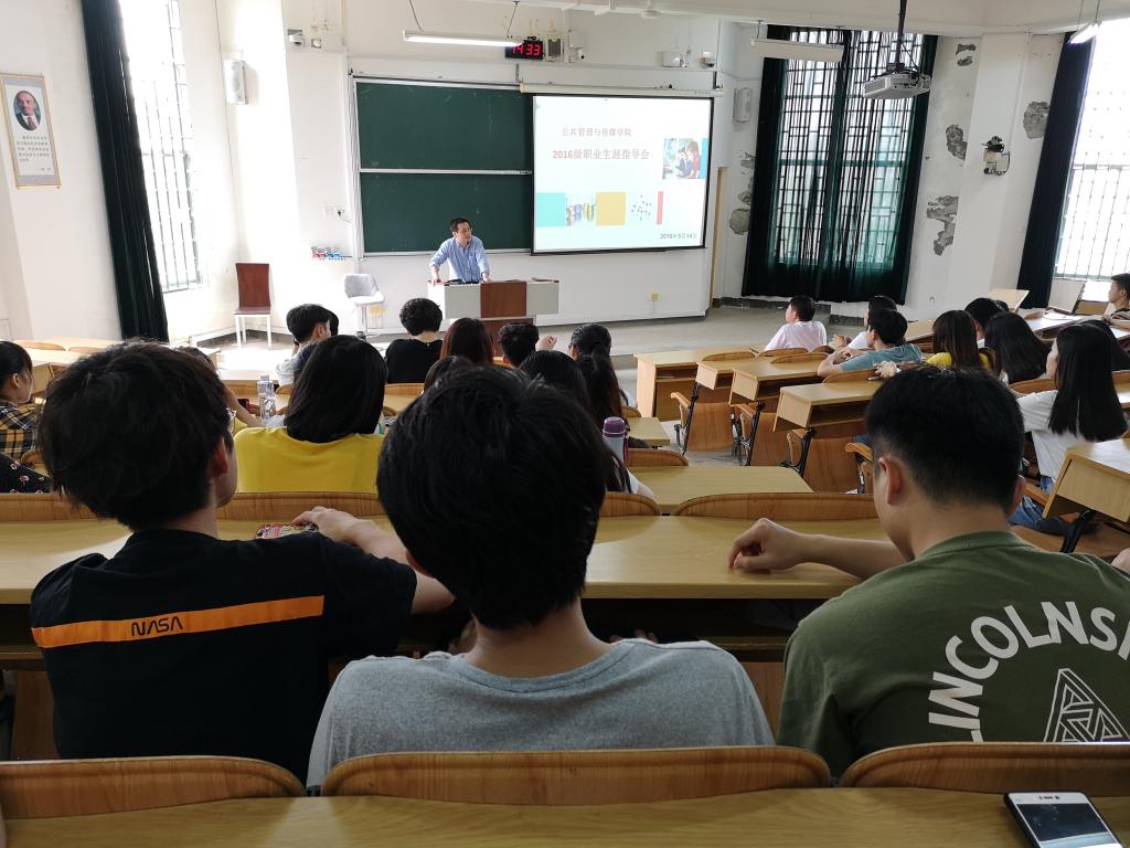 5月14日下午,公共管理与传媒学院在雁山校区05308教室召开2016级职业生涯指导会议,学院辅导员和全体2016级学生参加了会议,会议由学院党委副书记汪晟主持,学院副院长彭正波主讲。