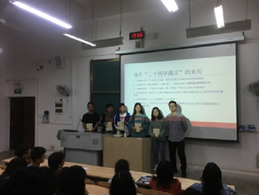 同学们也都有感而发,2019级传播学专业学生覃思然同学说到:作为壮族人,我没有肩负起继承壮族优秀传统文化的重任,我深感愧疚,但今天听了老师的讲解,我想我是时候为自己文化的继承出一份力了。同样身为壮族学生,行政管理专业周宗波同学认为:随着社会的发展与进步,壮族优秀传统文化正在逐渐被汉化,例如:“三月三”更在意的是放几天假而不是它的内涵与庆祝仪式。作为壮族当代青年,决不能让如此优秀文化消失于我们这一代。社会工作专业学生闭琼元也表示:我们身边到处都是社会主义核心价值观的标语,但我从没有认真关注和思考过,今天听了老师的介绍,我很震惊,原来短短的24个字中蕴含了如此大的能量,以后我也会加强学习,积极践行社会主义核心价值观。