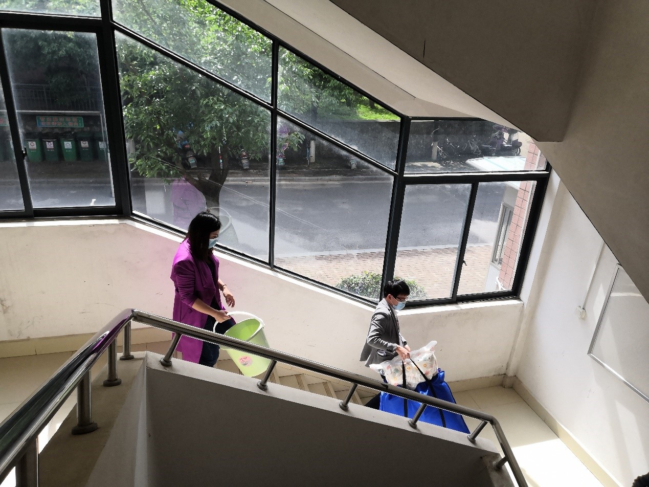 抵达二号组团宿舍楼下后,陶老师首先对需要健康观察的31位学生物品搬运工作进行了分工安排和布置,在全体辅导员老师、学院学生志愿者和宿管阿姨的共同努力下,各小组按照提前统计好的相关信息,对各位学生的被褥及生活物品进行了打包和搬运。随后,各年级辅导员老师对学生的被褥等物品进行了整理,并为每一位学生准备了零食礼包。