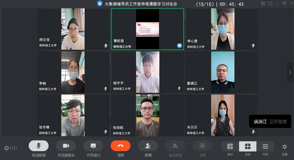 2020年5月30日,大数据辅导员工作室利用钉钉平台进行了疫情期间的线上课题申报学习讨论会,环境学院辅导员以及大数据辅导员工作室本年度申报课题的相关老师一起参会,会议由大数据辅导员工作室负责人郝文佳主持。