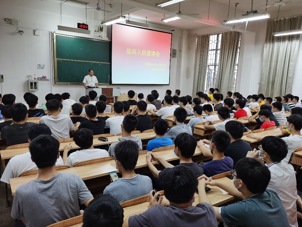 为深入推进我校大学生征兵工作,加强征兵政策宣传,鼓励广大学生积极投身绿色军营,献身国防事业,6月7日,环境学院在06408、06508教室,分别对2016-2019级全体男生开展大学生征兵宣传活动。