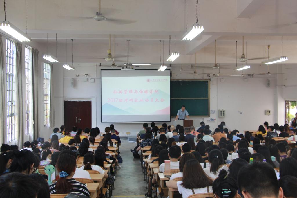 2020年9月15日下午,公共管理与传媒学院于06105举行2017级考研和就业动员大会。会议由副院长褚清华主持,学院教职工和管媒学院2017级全体学生参与。