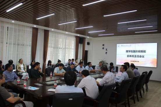 为进一步落实学校中秋国庆假期安全稳定工作,畅通班主任沟通渠道。9月29日下午,理学院在雁山校区08201-7会议室组织召开了中秋国庆假期前全体班主任会议,院党委书记欧阳胜权、院长肖剑荣以及学院全体党政班子领导、全体班主任和辅导员参会,会议由院党委副书记钟立军主持。