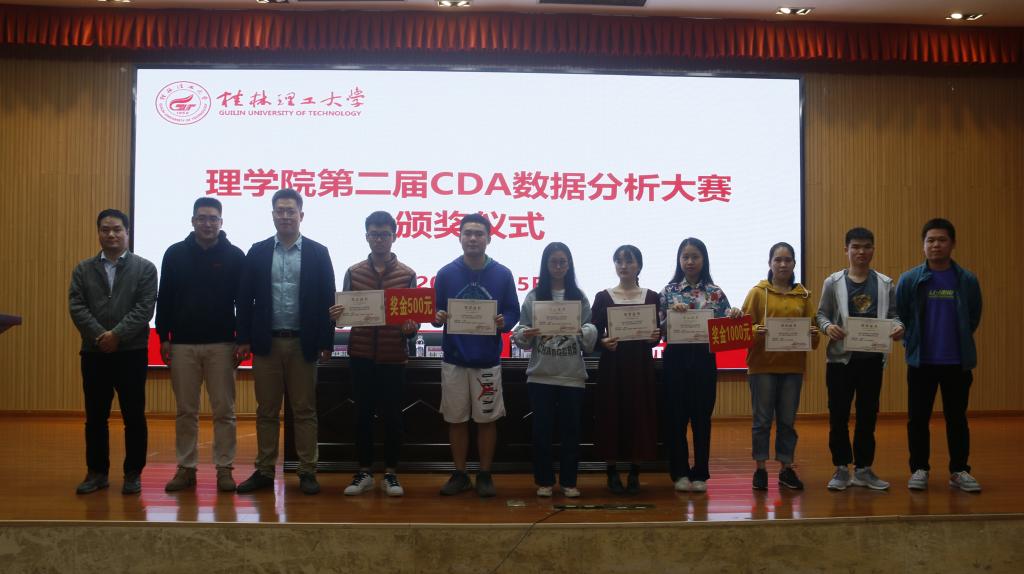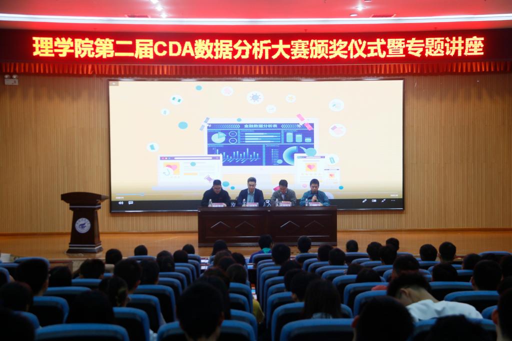 为表彰“理学院第二届CDA数据分析大赛”获奖学生,鼓励学子积极参赛。理学院于2020年11月5日19:00在雁山校区图书馆报告厅举办理学院第二届CDA数据分析大赛颁奖仪式暨专题讲座,理学院党委副书记钟立军、副院长蒋远营、团委副书记舒强、广西就学在线科技有限公司经理尹其斐以及所有获奖同学和理学院部分本科生200余人参与了本次颁奖仪式,本次颁奖仪式由舒强老师主持。
