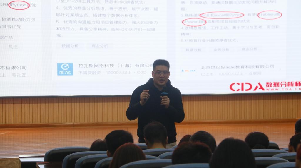 颁奖仪式结束后,由广西就学在线科技有限公司经理尹其斐为现场的同学们做数据分析专题讲座。